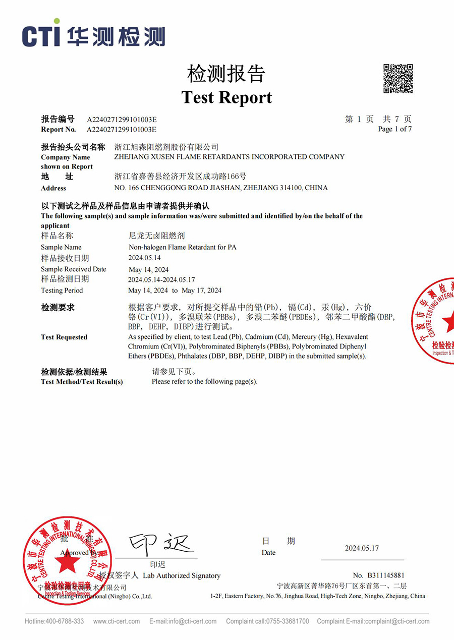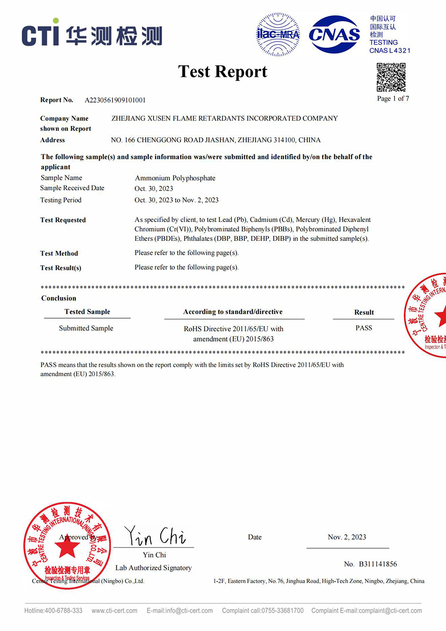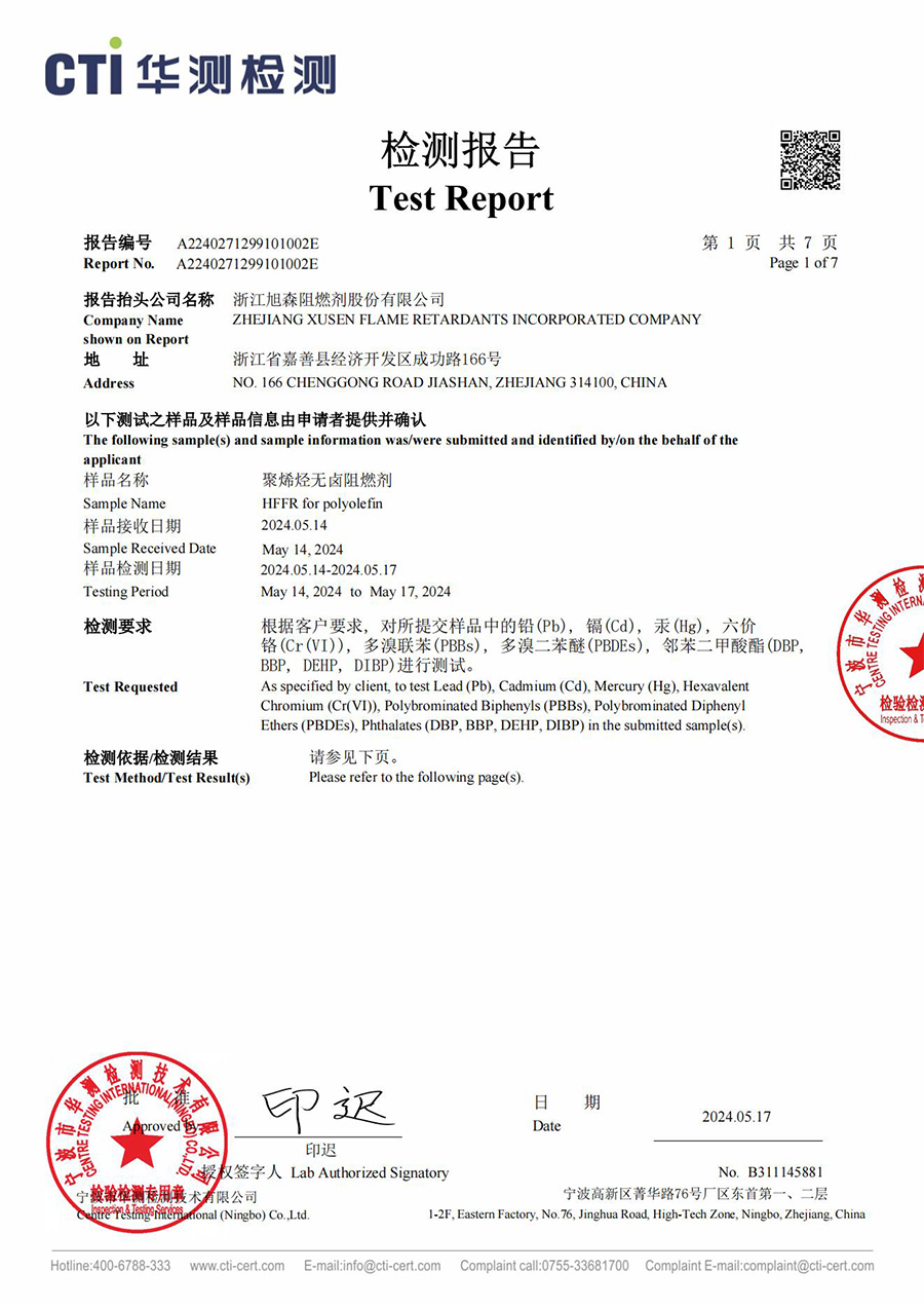 Retardant api untuk Laporan Tes Polyolefin ROHS